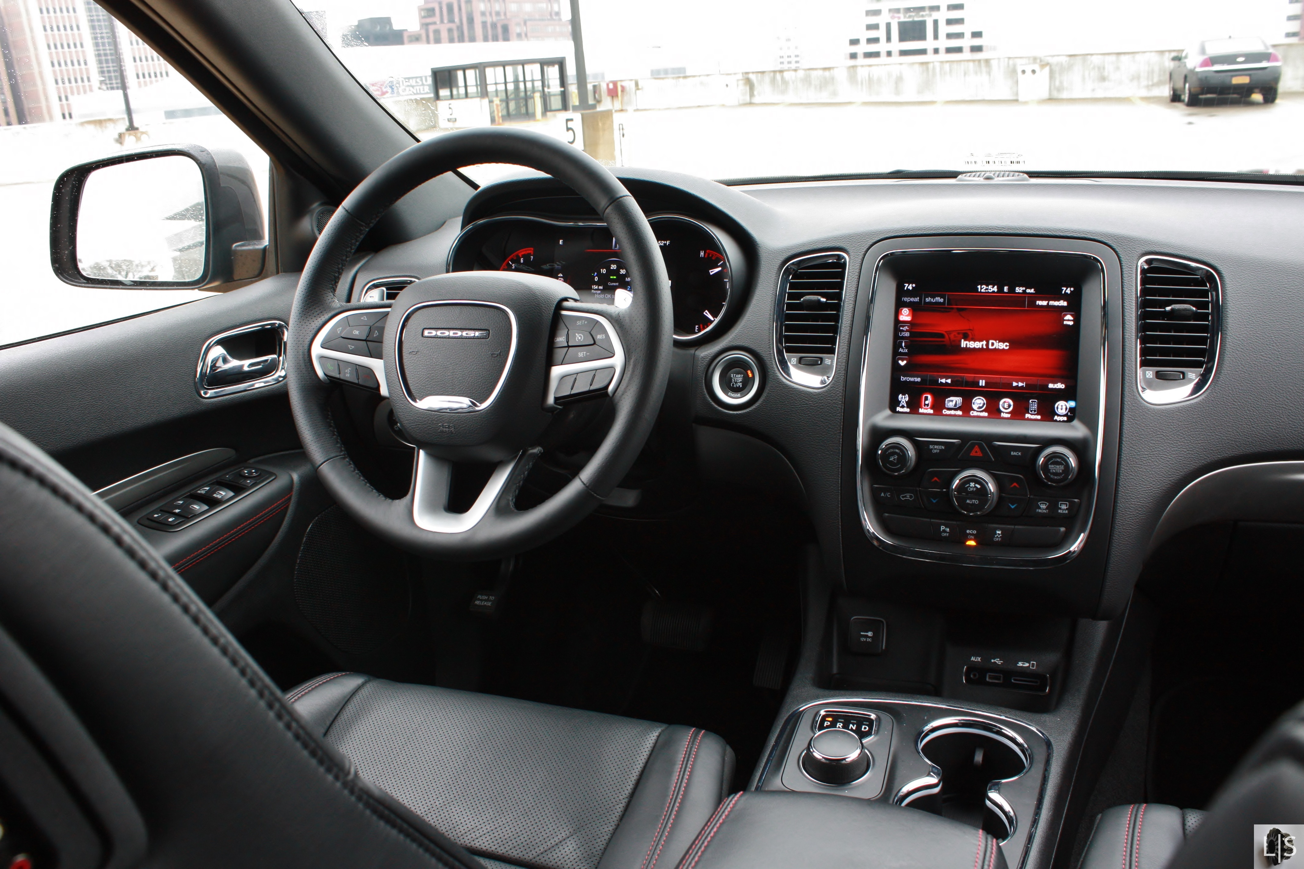 When it comes to power and ride, the Durango performs. For 2014, all Durangos get a new eight-speed automatic transmission. It shifts relatively smoothly, but we did notice a few times where it could have shifted into a lower gear sooner. The new transmission also improved its fuel economy rating, but rather minimally. The R/T is equipped with the 5.7-liter Hemi V8 shared with the Ram 1500, which has 360 hp and 390 lb-ft of torque. Like the Ram, the Durango R/T has cylinder deactivation to help contain its thirst. A small Eco button on the center console can toggle between savings or all-out power. The AWD Durango R/T is rated 14 city and 22 highway. In the week that we drove it, both city and highway driving, we managed a combined 16.5 mpg. On highways the fuel economy increased quite rapidly and we achieved nearly 22mpg on a longer highway run. A 3.6-liter V6 is also available.