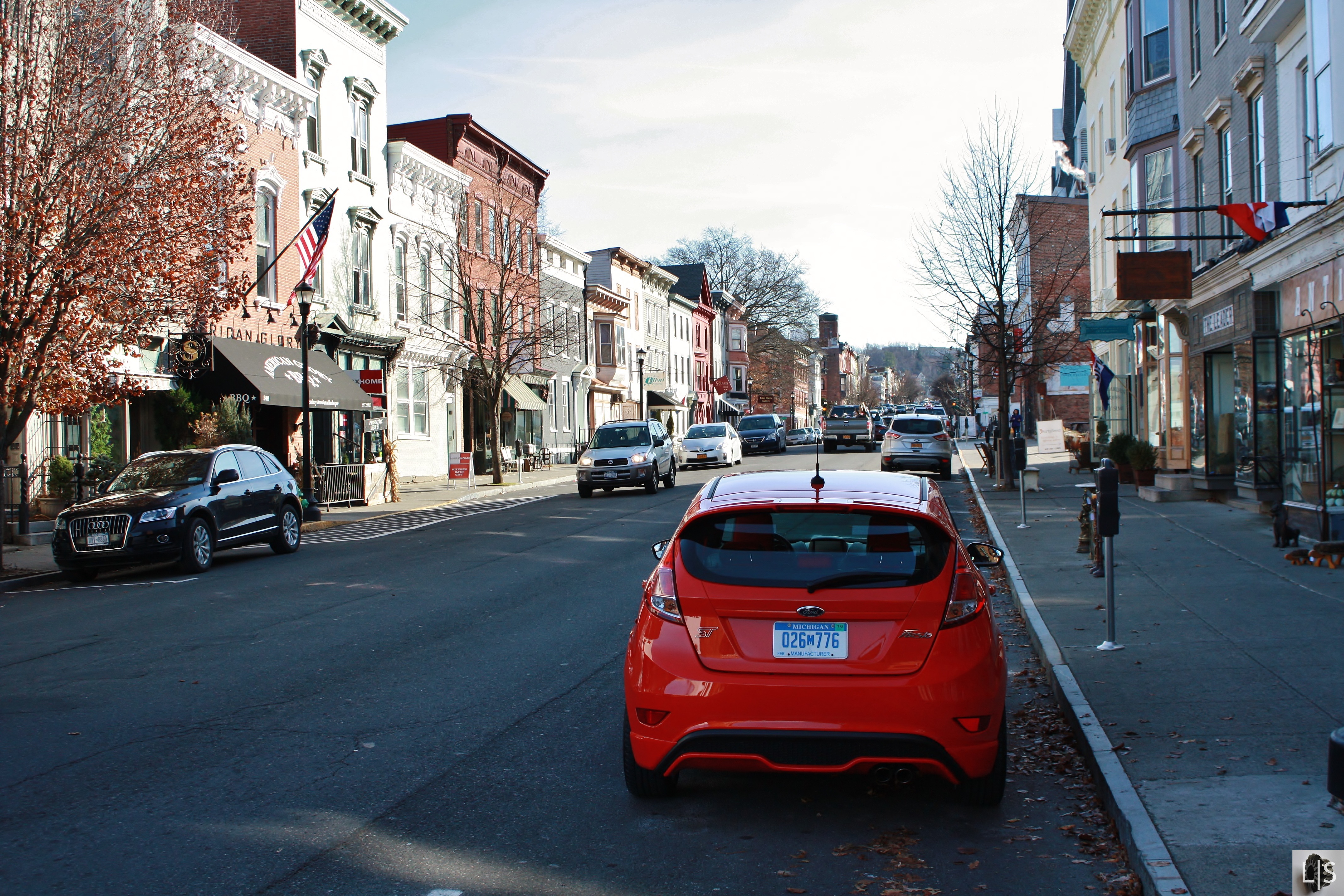 The drab and dreary grey of early December seemed lessened by the presence of the orange Fiesta. The aggressive body kit is one thing, but adding the Molten Orange package dispenses with all subtlety. The revised suspension hunkers the car down on its 17″ wheels. The trapezoidal front grille, adorned with the ST badge, hides the enlarged intercooler. A larger rear spoiler, split exhaust, and body-color diffuser differentiate the rear of the ST from your ordinary Fiesta. Behind the wheel of the ST, it feels like all eyes are on you. That’s exactly the kind of reaction the Fiesta ST deserves. We didn’t find it ostentatious or garish, but we certainly didn’t blend into the crowd.