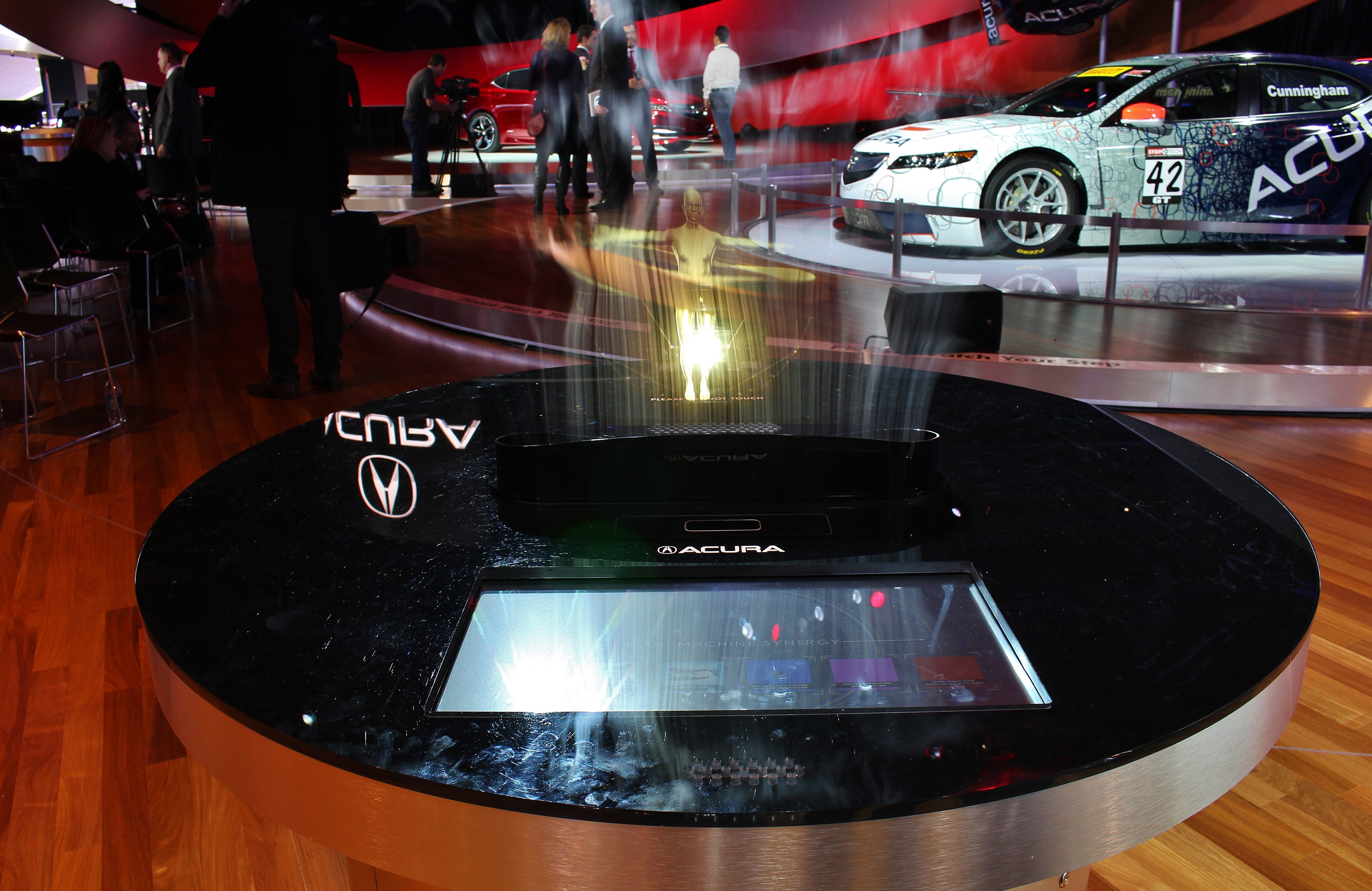 Acura’s display was centered around the unveiling of the TLX concept. Debuting in what appeared to be production-ready form, the TLX will probably replace the TSX in 2015. They even pulled the covers off of a TLX GT race car, which hopefully indicates that the new TLX will have more sporting characteristics. But we were distracted from all this good news by a nondescript round table spewing smoke like a miniature Eyjafjallajökull. What was it? Something about man-machine synergy. What was displayed on the console you ask? A naked man. While most manufacturers stick with iPads or giant touch screens, Acura literally went with smoke and mirror. That might not be the best way to share information.
