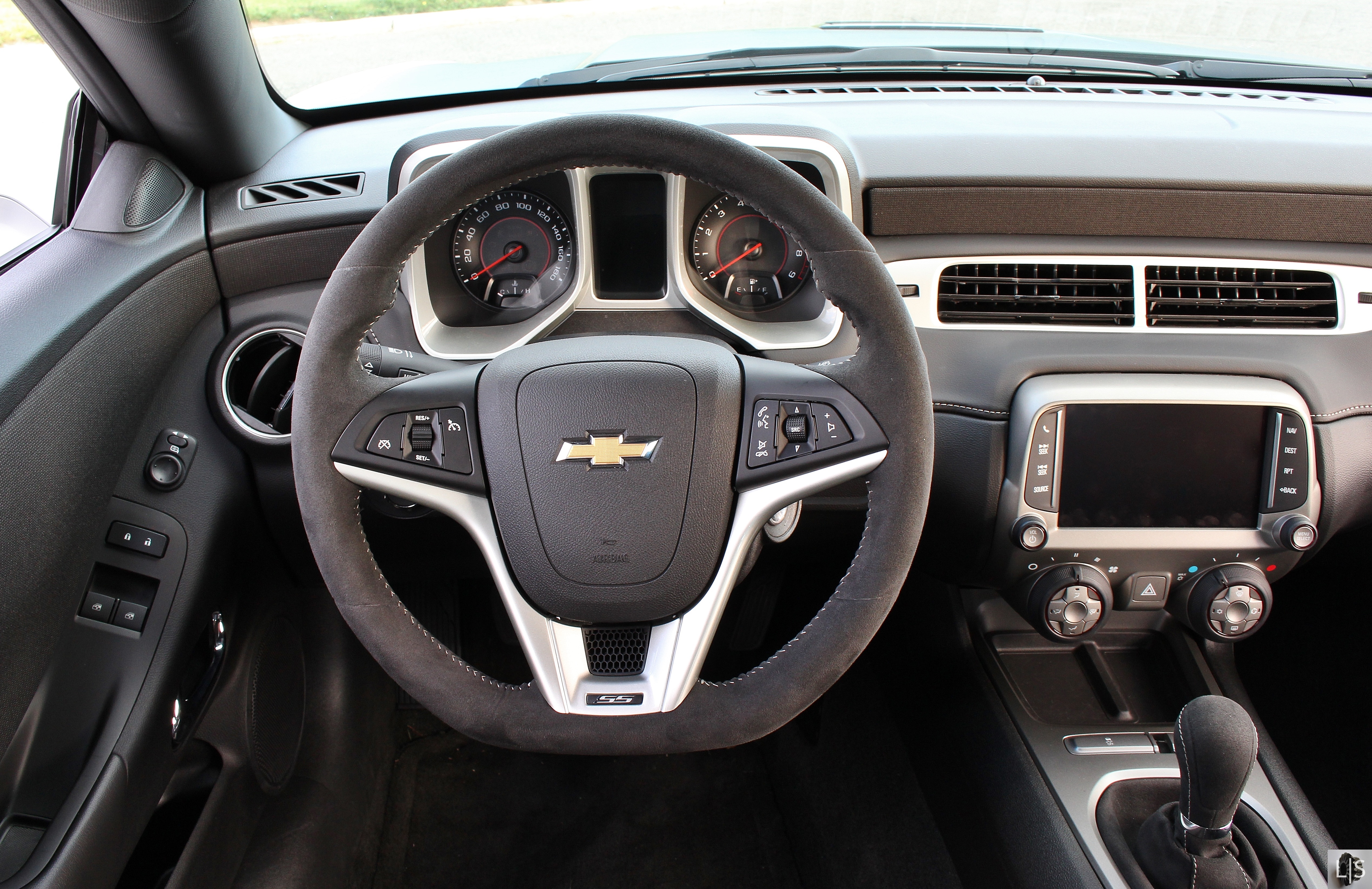 Our tester featured the optional, and pricey, Recaro performance seats. Trimmed in leather and alcantara, they fit in both form and function. With masses of side and thigh bolstering, they encourage the type of driving style that we have we, and this Camaro, try to promote. The affordable navigation and rear vision packages add some real-world comforts to keep this model from being overly track-focused. This Camaro is at home as a track car or touring car. The revised front end boasts a more sinister apperance, set off by the large cooling vent in the hood.