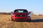 Inside, the Mustang feels positively plush compared to the interior of any Camaro. Well bolstered buckets are standard, but optional Recaros are available. The GT Premium comes with SYNC and MyFord Touch as standard. Our tester also came equipped with one option you won’t need with 5 liters of displacement, the 12-speaker Shaker audio system. Beneath the touch screen and HVAC controls, a row of airplane style toggle switches control the drive modes, traction control, and hazard lights. Unfortunately the Mustang is saddled with a busy steering wheel. A total of four control pads clutter the wheel. We’d like Ford to learn a lesson or two from Porsche and let the steering wheel have a singular purpose. The second set of controls are somewhat recessed, but you still bump them occasionally. It is, overall, one of our biggest disappointments in the car.