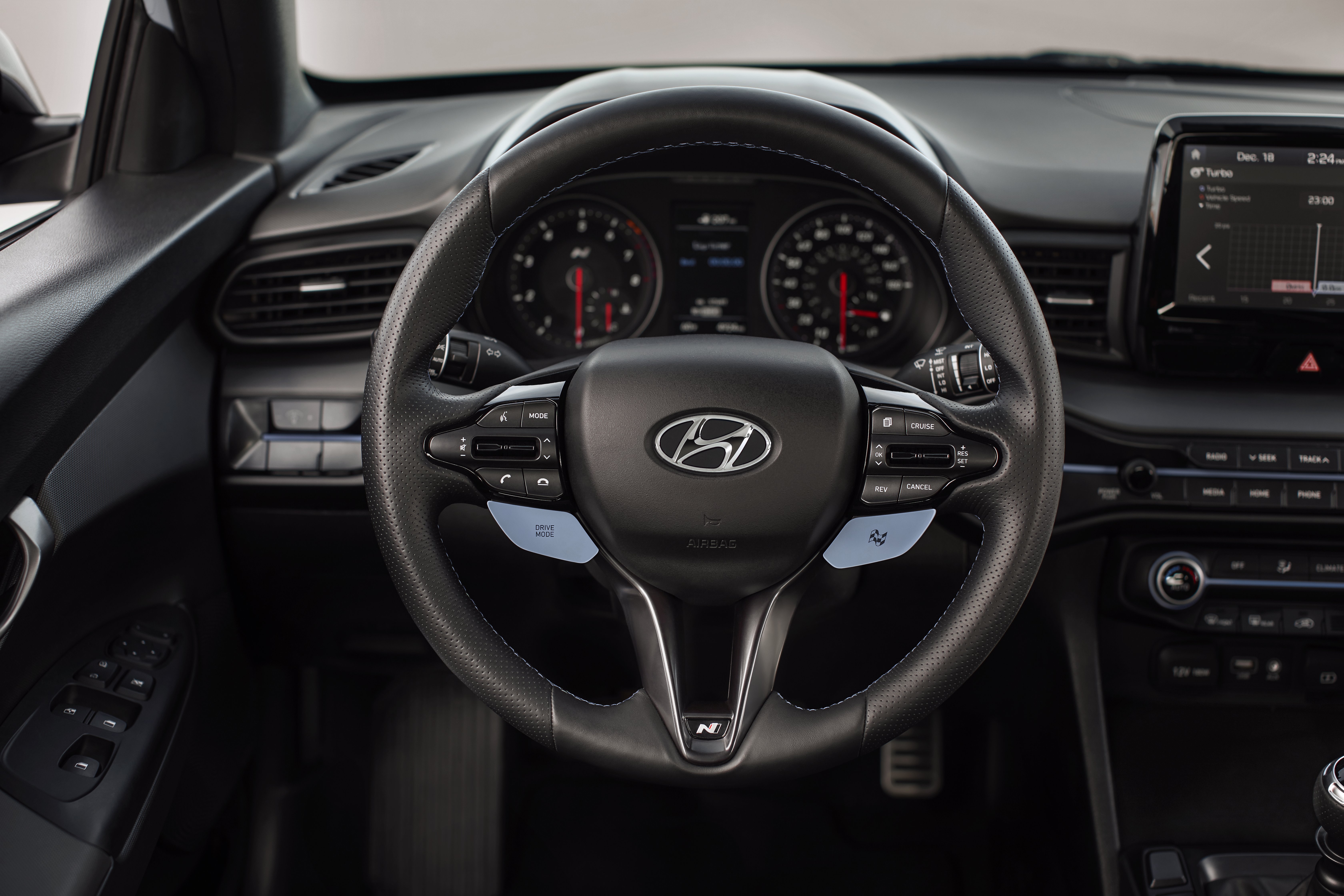 If the sound didn’t announce the Veloster’s N character, the refined boy-racer visuals will. Unique front and rear fascias, side sills, and grilles with red accents set off the appearance. But the tall rear spoiler and massive exhaust are what the enthusiasts will notice first. Inside, heavily bolstered sport seats and unique N-design steering wheel, shift knob, and instrument cluster add special cues at all the key touch-points. The N performance blue accents stand out on the seat belts and drive mode selectors on the steering wheel. The Veloster’s center stack is a perfect example of balance between screen and physical buttons. But there are little things, like the uncomfortable height of the center console compared to the shift lever. It might not be as refined inside as the VW GTI or Honda Civic Type R, but Veloster undercuts them both in price. And if it’s the performance you’re after, Hyundai spent the money where it counts.