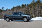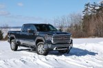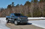 Riding the Sierra HD Denali is as luxurious and a half-ton Sierra or Yukon Denali. The leather-clad and wood-trimmed cabin features a crisp 8-inch touchscreen, 15-inch head-up display, Bose audio system, built-in WiFi, wireless charging, and Apple CarPlay and Android Auto connectivity. There’s also a huge number of cameras and sensors for park assist, lane change alert, blind zone and rear cross traffic monitors, and automatic emergency braking. There’s even GMC’s rear camera mirror, a feature that has come a long way since we first experienced it on the Cadillac CT6. For a class of truck that used to be solely focused on commercial applications, amenities like ventilated seats and a sunroof no longer seem out of place. In a week that brought bitter cold, snow, and rain, there wasn’t a condition that the Sierra HD couldn’t cope with. The auto-engaging four-wheel-drive system dealt with mud, snow, standing water, and ice with relative ease. All the while, we were comfortably warm with heated seats and a heated steering wheel sitting high above it all.