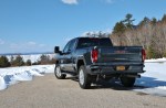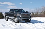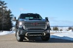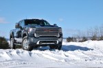 Beneath the hood of the Sierra HD is your choice of an all-new 6.6L gas V8 or the tried and true Duramax 6.6L V8 turbo-diesel. Both engines share an all-new Allison 10-speed automatic transmission. This first-in-class 10-speed gives the Sierra HD plenty of ratios so that it’s always working in an optimal range. In our tester, that helped make use of 445 horsepower and 910 lb-ft torque more readily. Of course we didn’t do any towing in our winter test, but we already know the Sierra HD can tow a GMC Canyon AT4 without breaking a sweat. In single-digit temperatures, we fitted the included winter front grille cover to help keep engine temperatures in operating range and improve cabin heating. By mid-week, temps had moderated and we stowed it neatly under the second row seats. If it weren’t for the pronounced turbo whine under heavy throttle and massive Duramax logo on the hood, you might not even our tester was a diesel. That was, until you had to fill the tank. We managed to travel 745 miles on a single tank, netting us 17.6mpg. The one telling aspect of every heavy-duty truck cannot hide, however, is the ride quality. Extra stiff springs and shocks meant for towing, plowing, and gooseneck trailering give the Sierra HD a choppy ride over poor road surfaces.