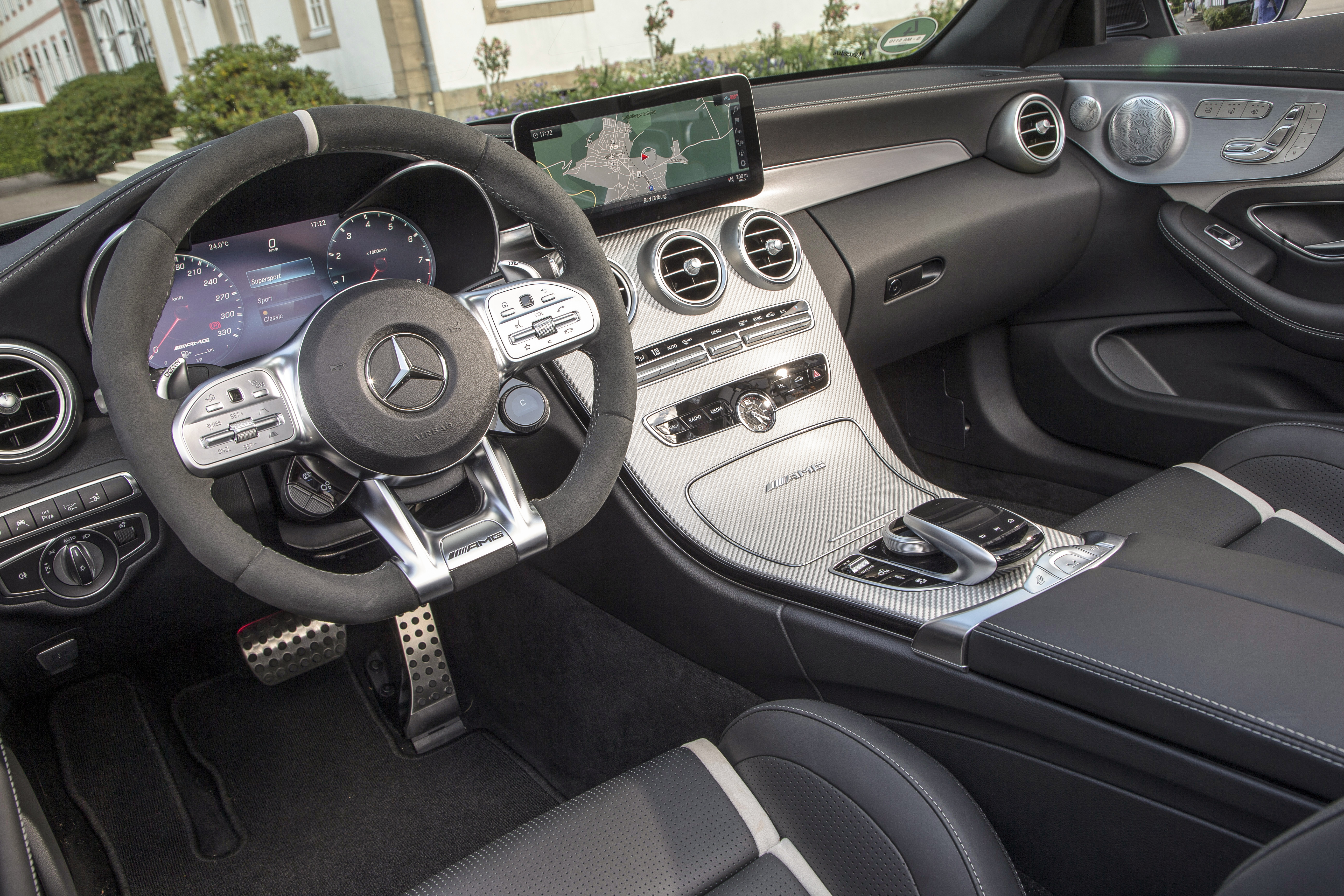 Inside, the Mercedes-AMG C63 S is wrapped in leather, carbon fiber, and alcantara. Our tester had the comfort seats rather than the AMG race seats, and we were thankful for that. The infotainment is Mercedes’ old system, not the new MBUX experience we had in the GLC earlier this year. No touchscreens here, still a rotary wheel and haptic pad that are difficult to use and and unintuitive to navigate with. The digital gauge cluster, a $750 option, is a great addition and we would go with that. On the steering wheel, there are two haptic buttons that you can use to navigate through all sub-menus of the gauge cluster or the infotainment. Those two sensors are the only way we used the center screen, and they worked accurately while allowing us to keep our hands on the wheel all the time.