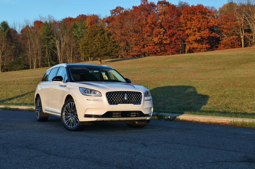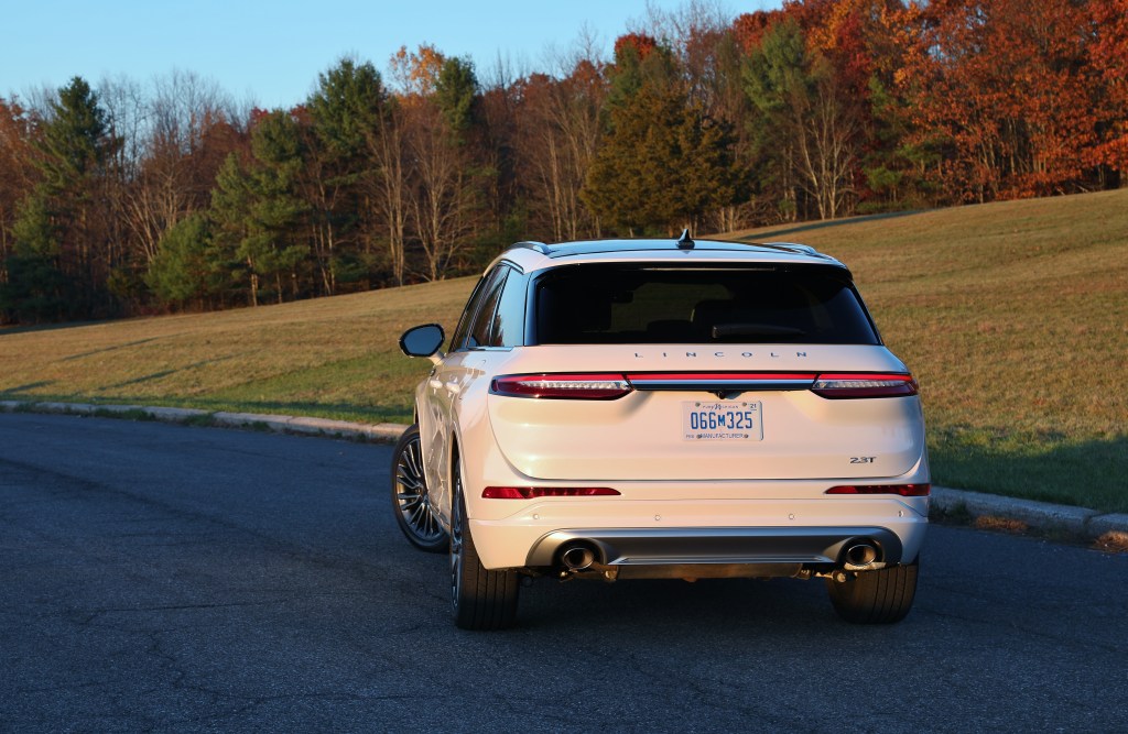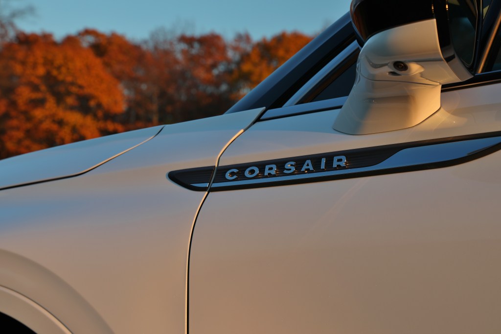 Our Corsair Reserve tester features the stunning Beyond Blue Interior Package, an option that outfits the cabin’s leather-covered surfaces in a lovely shade of blue with white trim. And when you open the door, those aren’t the typical annoying beeps you’re used to hearing. Lincoln recorded the Detroit Symphony Orchestra playing several unique chimes for use in the Corsair as warnings for things like open doors or unbuckled seat belts. The horizontal design of the interior and cantilevered console provide a feeling of openness without moving the controls out of reach. Unfortunately, the infotainment screen’s placement and size make it feel like an afterthought. Abundant interior lighting and a fully digital dash screen offer several configurations to match cabin visuals to the driver’s mood. Front occupants enjoy 24-way heated and cooled seats with massage capability. They’re extraordinarily comfortable, though not quite as sophisticated as the Navigator’s 30-way seats. Rear occupants make due with heated seats, though the second row does tilt and slide, offering surprising comfort and exceptional legroom. The massive glass sunroof adds plenty of light to the cabin as well.