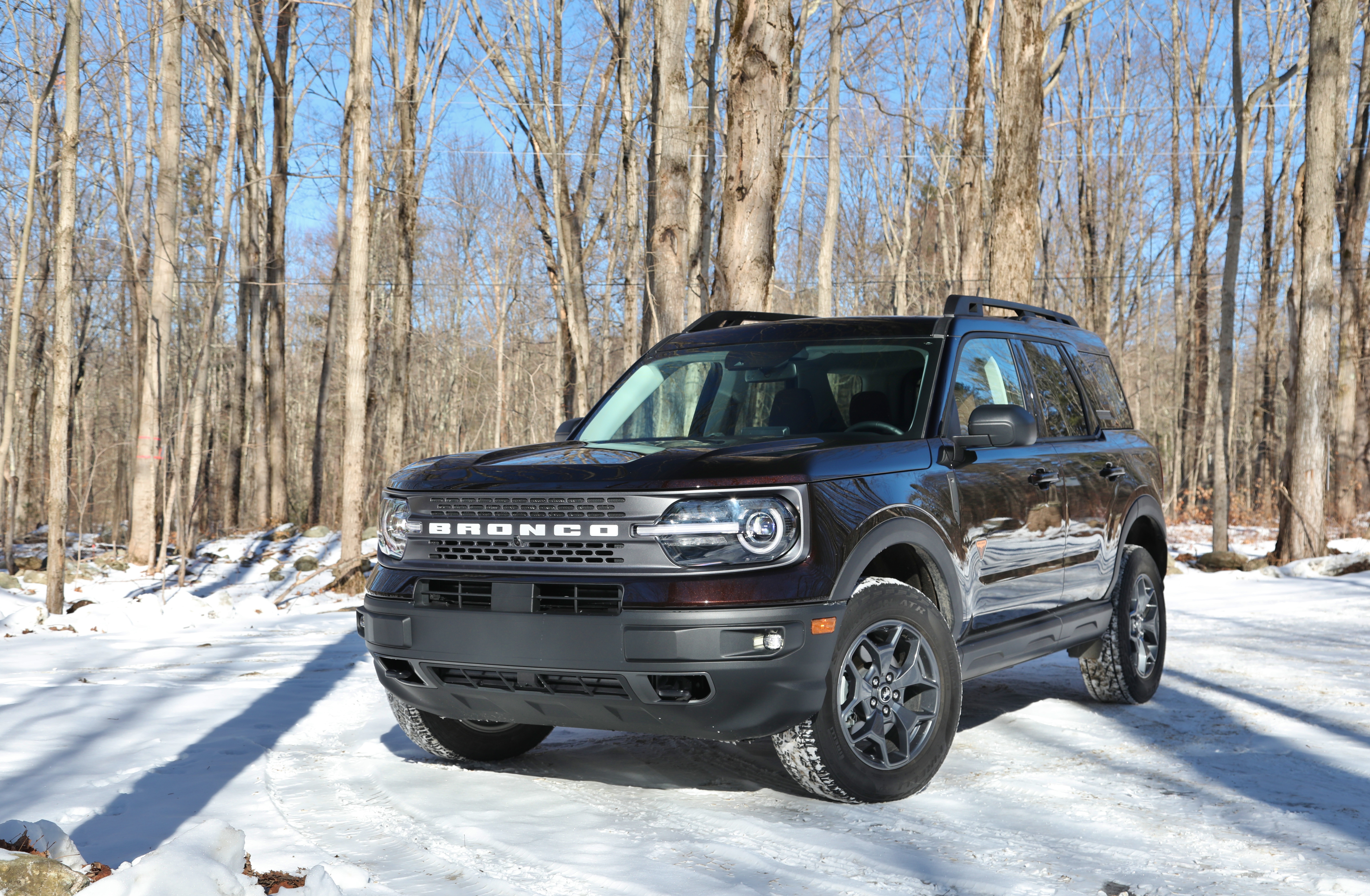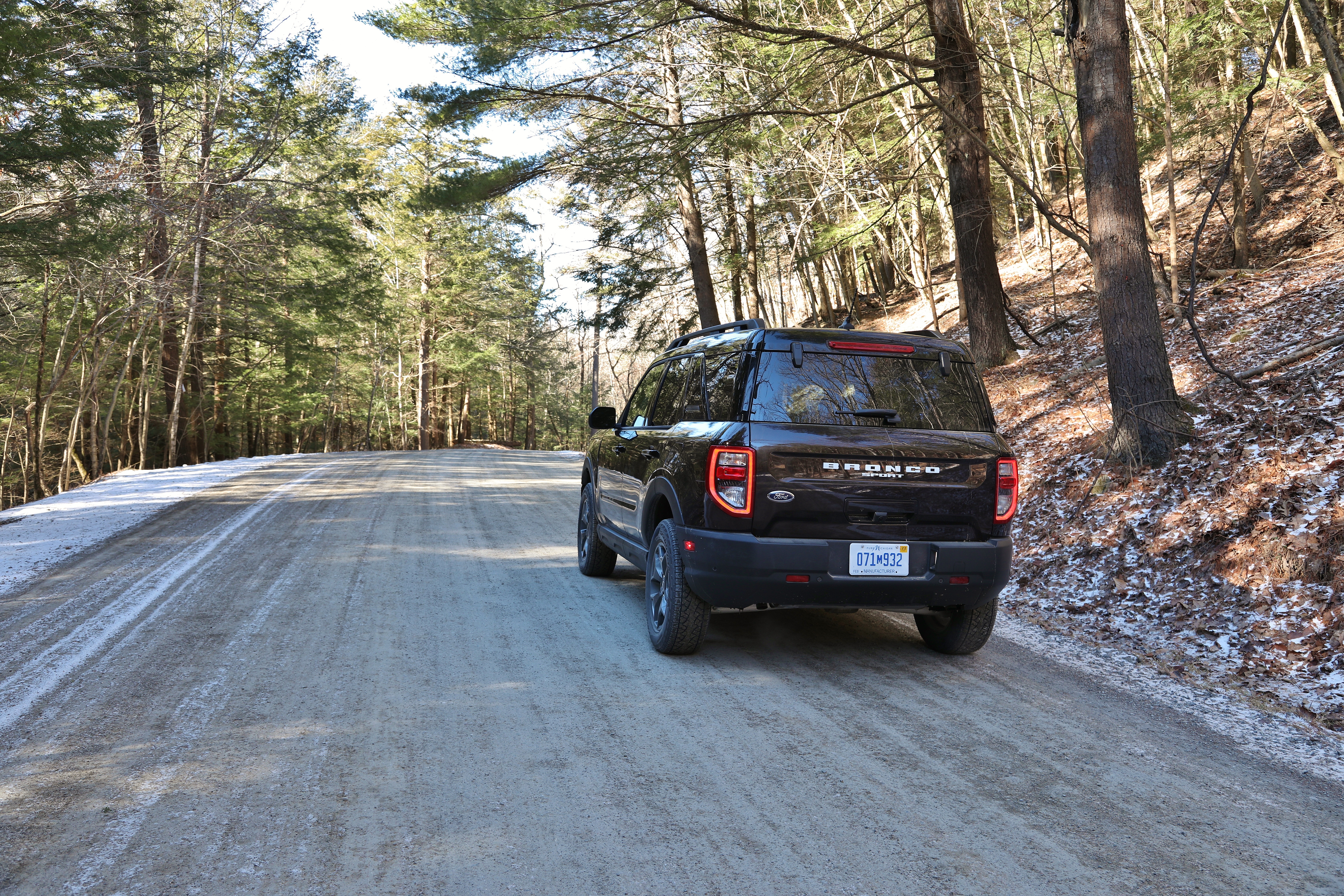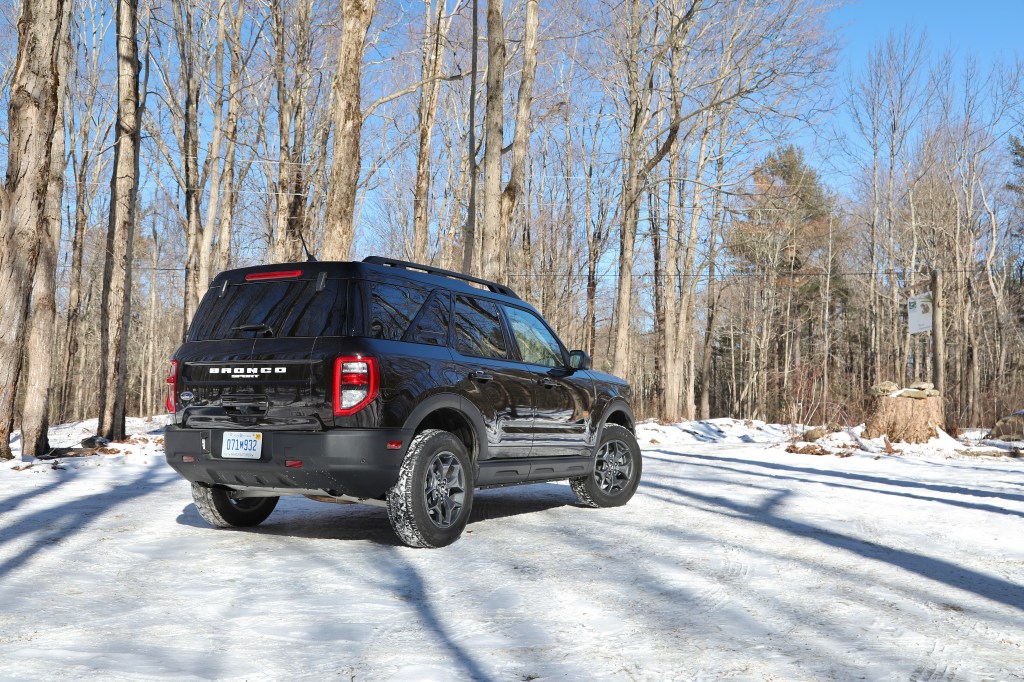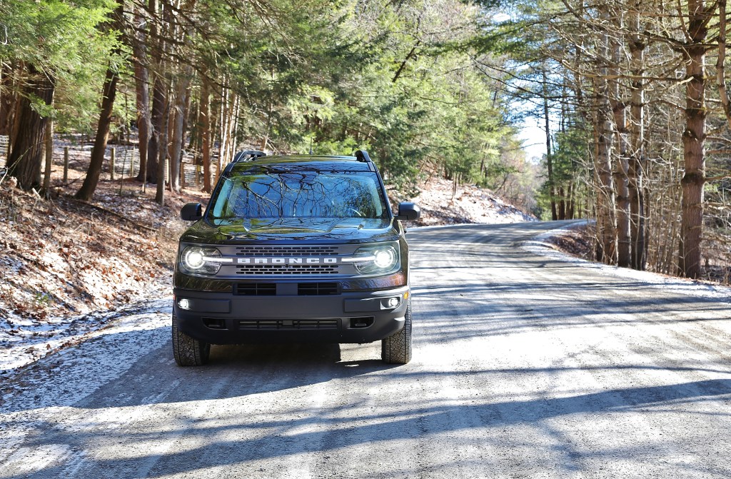 We took the Bronco Sport on two very different drives in our long weekend of testing. First, we decided on some highway driving to Lee, Massachusetts. The Bronco Sport handled the mundane task of highway driving well enough. On the highway, there is a bit of expected tire noise from the all-terrain tires. Inside, the seat bottoms are a bit short for taller occupants, but we’ve noted that about Ford products in the past. The infotainment system is Ford’s familiar SYNC interface as well and easy to use. The only true disappointment was the fuel economy, which averaged 19.9 MPG combined in our 4 days of testing. The squared-off shape, 20+ mph headwinds winds, and off-road tires likely didn’t help our highway drive. After our trip out-of-state, we took the Bronco Sport on a winter hiking expedition closer to home. The trip took out down several dirt roads until we ended up on a remote, snow-packed seasonal road. Perhaps the only place where Ford got cutesy with the Bronco Sport is the “Goes Over Any Type of Terrain” modes, a.k.a. “G.O.A.T” modes. Don’t ask us why it there’s only one “T”…but the system works well. You could individually select locking the SUV into four-wheel-drive or engaging the rear differential lock, or you could simply rotate the G.O.A.T. selector to Mud/Ruts, Sand, Rock Crawl, or even Slippery and the ideal setup is automatically engaged. This set-it-and-forget-it approach to off-road setups makes it simple for anyone to feel confident leaving the pavement. We’re happy to report the Bronco Sport had no trouble over gravel, sand, or snow-packed roadways. The suspension provided the soft yet connected ride to carry some real speed through the woods.