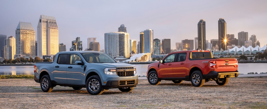 Starting under $20,000, the Maverick features a 2.5L four-cylinder hybrid powertrain that produces a combined 191 horsepower and 155 lb-ft torque. Power is sent to the front wheels through a continuously variable transmission. Ford is targeting an EPA-estimated 40 mpg city with a total range of 500 miles on a single tank. If hypemiling isn’t you’re thing, the hybrid Maverick has a standard payload of 1,500 lbs or can tow up to 2,000 lbs. If you need more power or more towing capability, an optional 2.0L EcoBoost engine provides 250 horsepower and 277 lb-ft torque to an 8-speed automatic transmission with standard front-wheel or optional all-wheel-drive. When equipped with the optional 4K Tow Package, the Maverick’s tow rating doubles to 4,000 lbs. An optional FX4 package on all-wheel-drive Mavericks adds all-terrain tires, unique suspension tuning, additional under-body protection, extra off-road drive modes, and hill decent control.